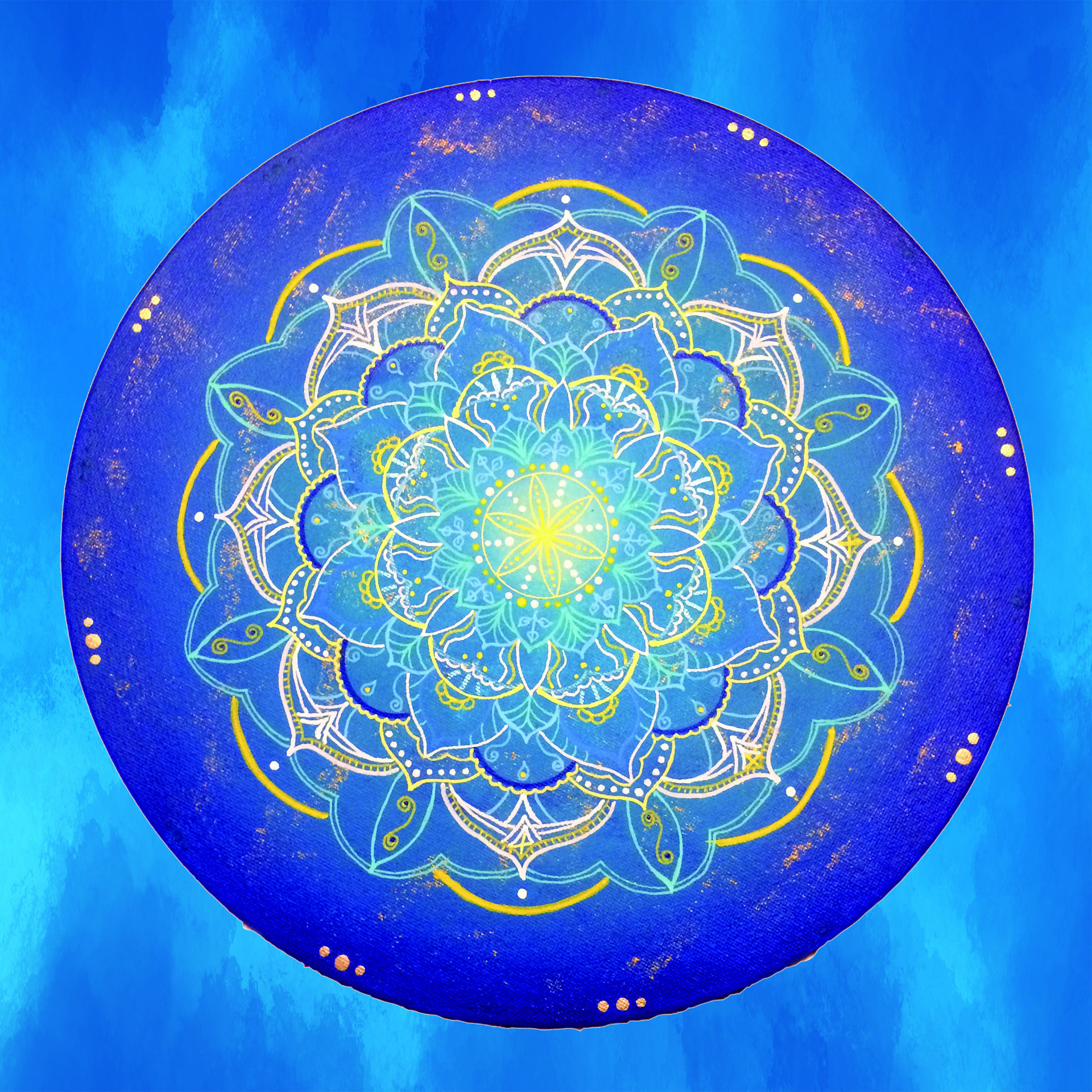 Darüberhinaus zeichne ich Mandalas und Lebens-blumen als Unikate auf alte Dachschieferplatten, Holz und Leinwand. Ich benutze keine Schablonen. Zirkel und Lineal sind meine Werk-zeuge, die Formen entstehen nach und nach frei Hand.